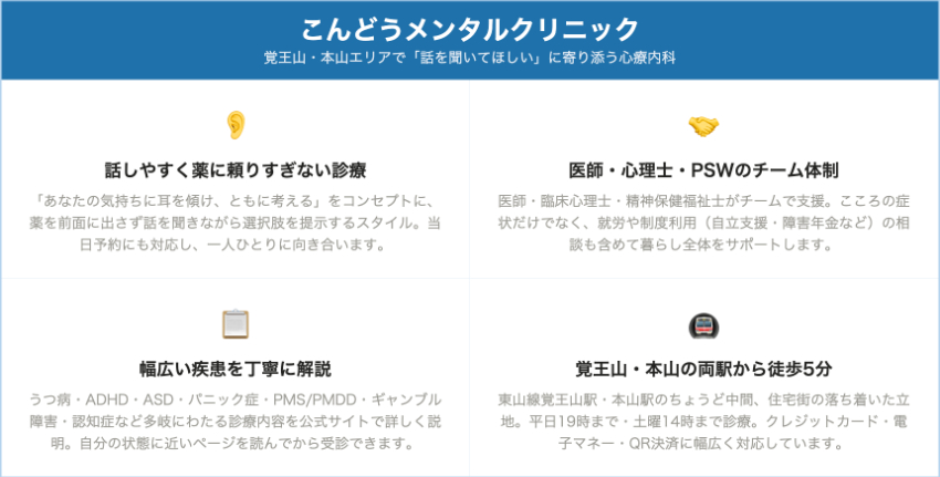 - 必要に応じて精神科専門病院や他科へ紹介してもらえるため、「まず相談する窓口」として機能しやすい