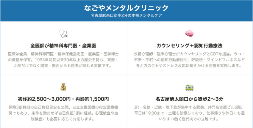 | なごやメンタルクリニック | 名古屋駅太閤口徒歩2〜3分 | 名駅西口/精神科専門医・産業医/カウンセリング併用 | 初診:約2,500〜3,000円/再診:約1,500円(保険3割)/保険外文書各種あり |