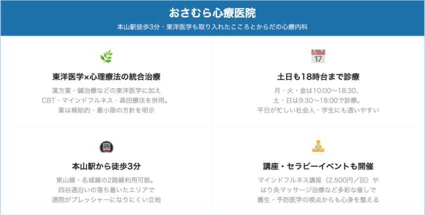 | おさむら心療医院 | 本山駅徒歩3分 | 漢方・鍼・マインドフルネスなど東洋医学+心理療法が豊富 | 保険初診:約3,300円前後/保険再診:約1,650円前後/自費カウンセリング〜50分:8,250円・〜75分:12,100円/診断書(一般):3,850円 |