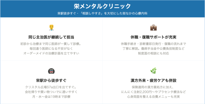 | 栄メンタルクリニック | 栄駅クリスタル広場S7a出口すぐ | 栄ど真ん中の心療内科・精神科/休職・復職相談が充実 | 診察:保険診療(初診・再診の具体額はサイトに明記なし)/にんにく注射1A:2,200円/2A:3,200円/血管年齢検査:2,400円 |