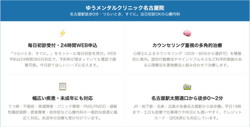 | 名古屋心療内科ゆうメンタルクリニック名古屋院 | 名古屋駅太閤口徒歩0〜2分 | 当日初診OK/土日診療/一般的な心療内科疾患を広くカバー | 初診:約3,000〜6,500円前後/再診:約1,200〜1,400円前後(保険3割)/診断書(当院様式):4,900円/自立支援診断書:6,600円/手帳診断書:8,800円 など |