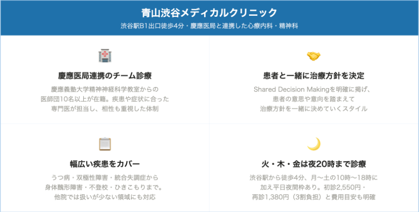 休職・復職や傷病手当、自立支援医療など制度面のサポートも手厚いため、まずは今の状態をきちんと評価してほしい、働き方や環境調整まで含めて相談したいと考えている方に、自信を持っておすすめできる渋谷エリアの心療内科クリニックです。