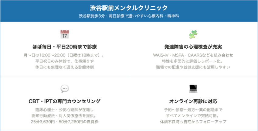 渋谷駅前メンタルクリニック渋谷・公園通り(渋谷駅徒歩約3分)約4,000円前後約2,000円前後カウンセリング25分3,630円/50分7,260円、WAIS-IV 19,000円、MSPA 13,000円渋谷駅近・毎日診療・精神科専門医+心理士で薬だけに頼らない治療、大人の発達検査が充実
