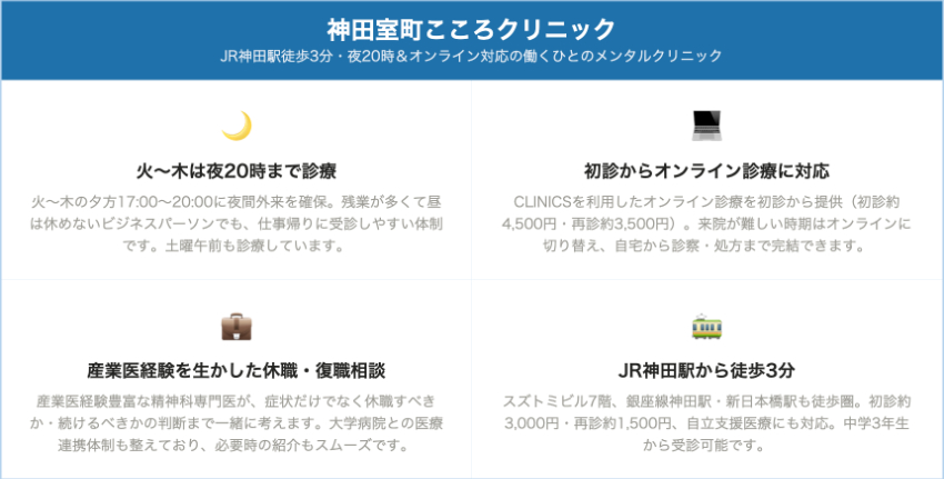 神田室町こころクリニック神田・新日本橋(神田駅徒歩約3分)対面初診 約3,000円/オンライン初診 約4,500円対面再診 約1,500円/オンライン再診 約3,500円20歳未満診察加算 +1,050円神田駅近・火〜木は20時まで、初診からオンラインOK、自立支援対応、働く人と高校生世代の不安症にも配慮