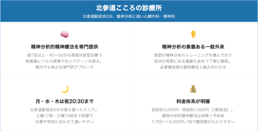 北参道こころの診療所北参道・千駄ヶ谷・原宿初診 約3,000円再診 約1,500円精神分析的精神療法 1回7,700〜13,200円、診断書4,950〜16,500円高校生以上対象。一般外来+精神分析的精神療法に強み、長期の対話型治療で生きづらさに向き合いたい人向け