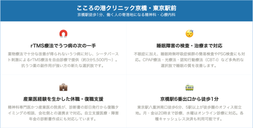 こころの港クリニック京橋・東京駅前京橋・東京駅八重洲南口2,500〜5,000円前後約1,500円前後診断書 5,500円、自立支援診断書等5,500〜13,200円、rTMS1回5,500〜7,700円精神科専門医+産業医。うつ・睡眠・休職/復職支援に強く、rTMSと睡眠検査も行う働く人特化型