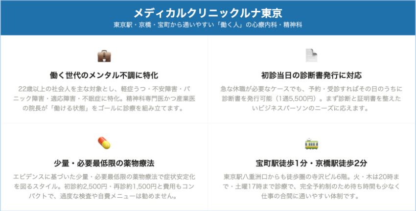 メディカルクリニックルナ東京の一番の特徴は、22歳以上の社会人を主な対象とし、軽症うつ病・不安障害・パニック障害・適応障害・不眠症など、働く世代に多いメンタル不調に特化している点です。