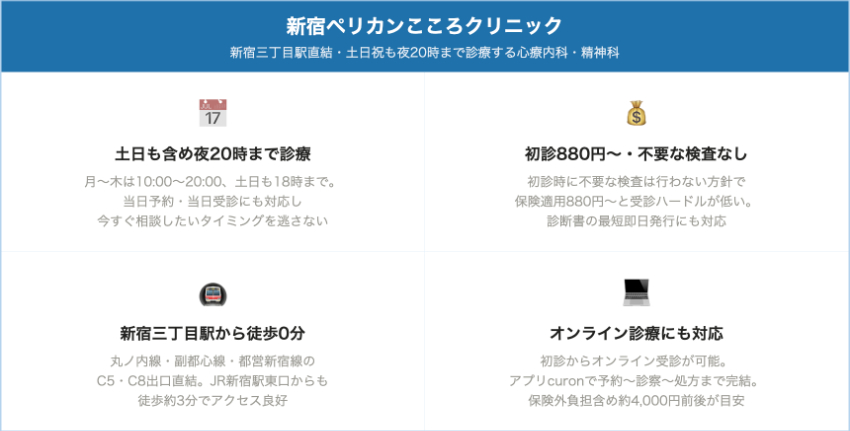 新宿ペリカンこころクリニック新宿三丁目直結・新宿駅徒歩3分初診 880円〜保険診療点数により変動/一般的に1,000〜3,000円程度オンライン診療システム料 3,000円+アプリ料300円+税(約4,000円前後)新宿三丁目駅直結・土日祝含め毎日診療、当日受診&診断書最短即日、休職・傷病手当金サポートに強い