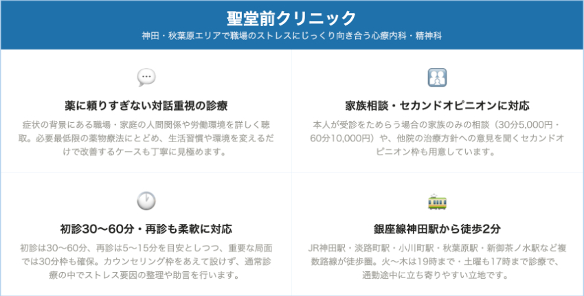 聖堂前クリニック神田・秋葉原(神田駅徒歩2〜3分)保険診療:一般的な心療内科水準(公式に具体額の記載なし)同左一般診断書4,000円、自立支援診断書5,000円、家族相談30分5,000円/60分10,000円神田〜秋葉原のオフィス街。職場のストレス重視、薬は必要最低限、家族相談・セカンドオピニオンにも対応