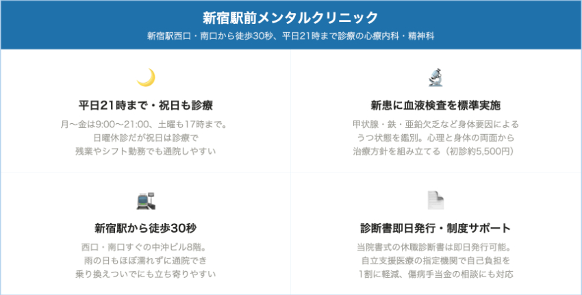 新宿駅前メンタルクリニック新宿駅西口・南口徒歩30秒初診 3,000〜4,000円/新患+血液検査 約5,500円前後再診 1,100〜1,500円程度診断書 4,900〜16,500円(内容により)新宿駅超駅チカ・平日21時まで・土曜午後あり。新患は血液検査で身体要因も確認、診断書・自立支援対応が明快