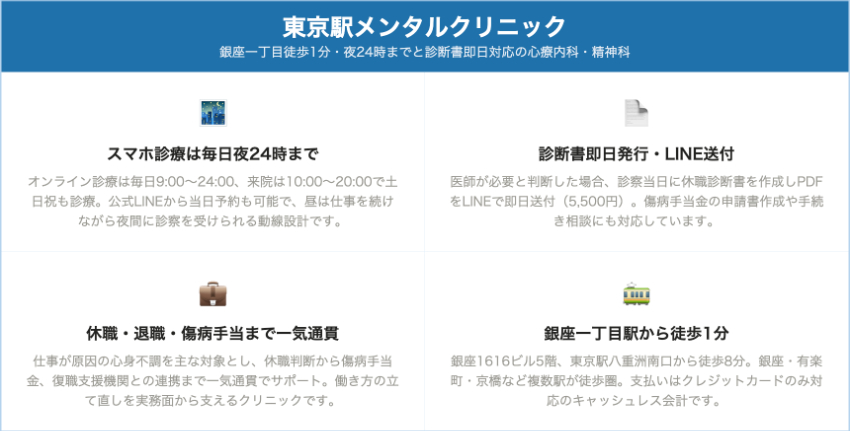 東京駅メンタルクリニック銀座一丁目・東京駅八重洲来院初診+診断書 約8,000円/スマホ初診+診断書 約8,000〜9,000円再診(来院・診断書なし)約1,000〜2,000円/スマホ再診 3,000円診断書代 5,500円(診察料に上乗せ)銀座一丁目駅徒歩1分。スマホ診療9〜24時、診断書を当日LINE送付、休職・傷病手当金・退職相談に特化