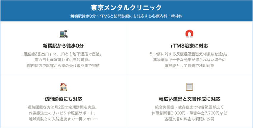 東京メンタルクリニック(新橋)新橋・銀座口(新橋駅徒歩0分)約2,500円前後約1,500円前後自費診察 8,000〜25,000円、各種診断書 2,200〜7,700円新橋駅前、16歳以上対象、うつ〜統合失調症・依存症まで幅広く外来、rTMS・訪問診療・院内処方に対応