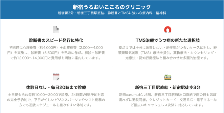 新宿うるおいこころのクリニック新宿駅南口徒歩3分・新宿三丁目直結初診 2,500〜5,000円再診 1,500〜2,500円心理検査 約4,000円/血液検査2,000〜4,000円/診断書約5,500円休診日なしで毎日10〜20時。うつ病TMS治療と診断書発行に強く、初診時に心理+血液検査でしっかり評価