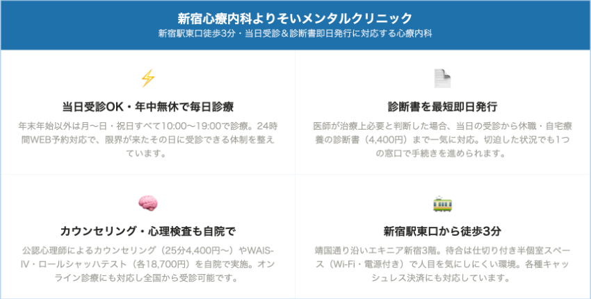 新宿心療内科よりそいメンタルクリニック新宿東口・歌舞伎町入口約2,000〜5,000円約1,500〜3,000円診断書 4,400円、カウンセリング25分4,400円/50分8,800円、WAIS-IV 18,700円年末年始以外ほぼ毎日10〜19時、当日受診&診断書最短即日、家族相談や心理検査も院内完結