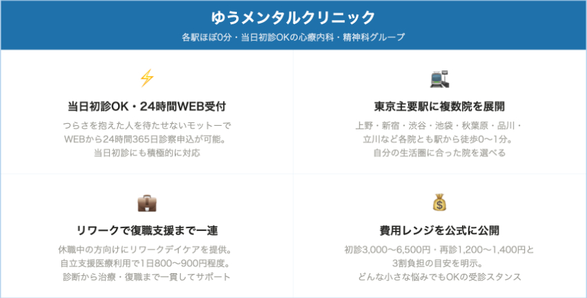 ゆうメンタルクリニック(グループ共通目安)上野・新宿・渋谷・池袋など主要駅前初診 3,000〜6,500円前後再診 1,200〜1,400円前後リワーク利用(自立支援1割時)1日800〜900円目安駅ほぼ0分の多院展開。WEB24時間受付&当日初診OK、うつ・不安からリワークまで通いやすさ重視のグループ