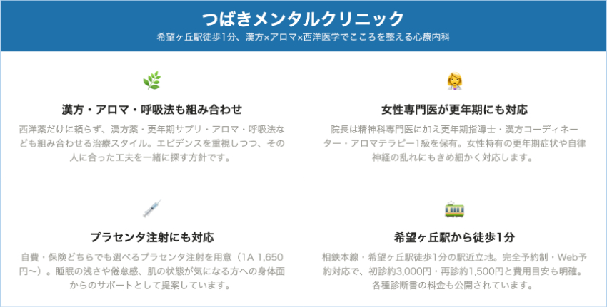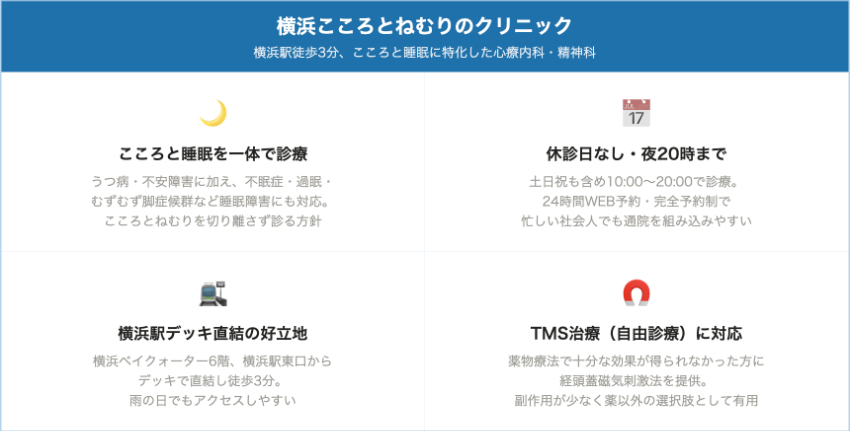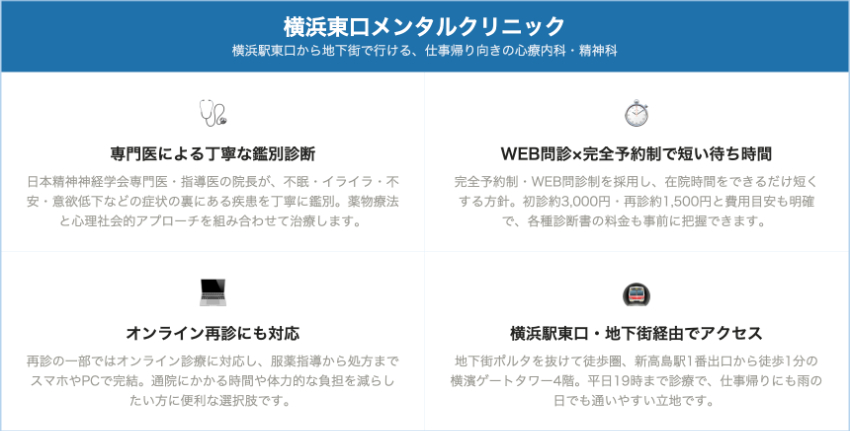 日本精神神経学会専門医による診療と、オンライン再診の選択肢がある点から、眠れない・イライラする・不安でたまらないといった不調を、忙しい生活の中でも計画的にケアしていきたい横浜エリアのビジネスパーソンに特にフィットするクリニックです。