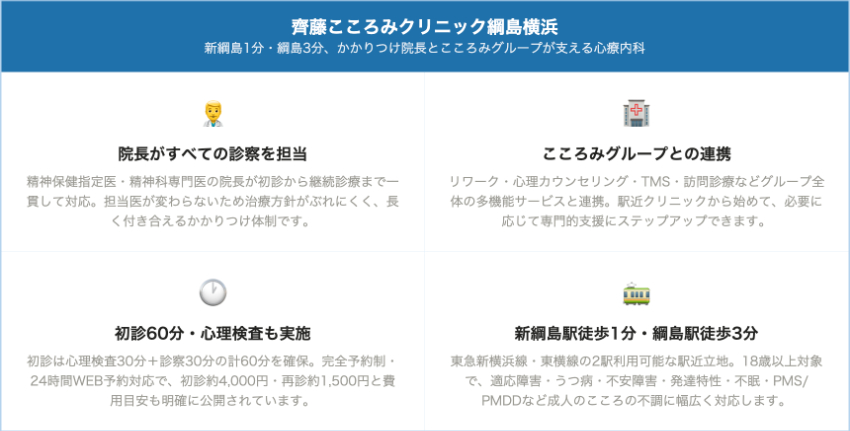 | 齊藤こころみクリニック綱島横浜 | 新綱島駅徒歩1分・綱島駅徒歩3分 | 初診・再初診 約4,000円 | 再診 約1,500円 | グループ全体でカウンセリング・リワーク・TMS等を提供 |