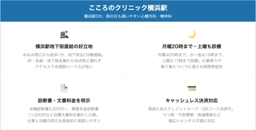 ここでは、横浜エリアで自分に合った心療内科を選びやすいよう、アクセスや診療時間、費用の目安をわかりやすくご紹介します。