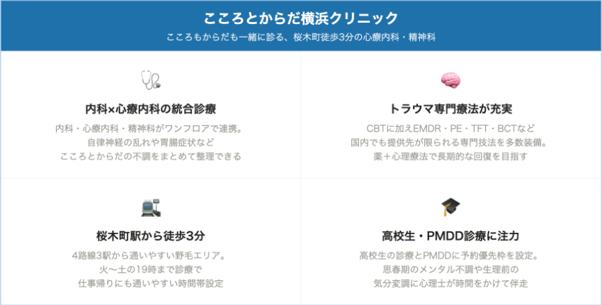 初診では、横浜駅や桜木町、関内、みなとみらいなど自分が通いやすいエリアで、診療内容と得意分野が自分の症状に近いクリニックを選ぶのがおすすめです。不眠や不安が中心なら一般的なメンタルクリニックでよく、腹痛や下痢など胃腸症状が強いなら、心身症や内科連携などの記載がある心療内科が向きます。口コミだけで決めず、公式サイトの説明も確認しておくと安心です。