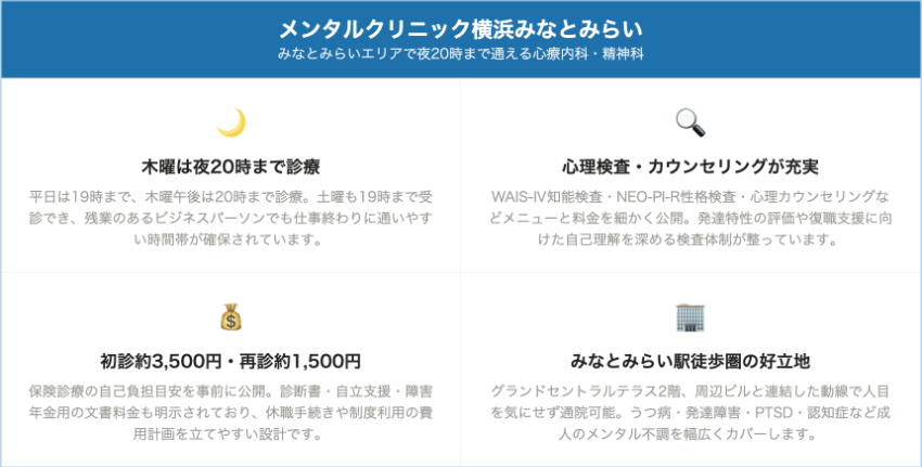 | メンタルクリニック横浜みなとみらい | みなとみらい駅周辺 | 約3,500円 | 約1,500円 | 心理カウンセリング 1回 8,000円 / WAIS-Ⅳ(診断目的)18,000円 / NEO-PI-R 14,800円 など |