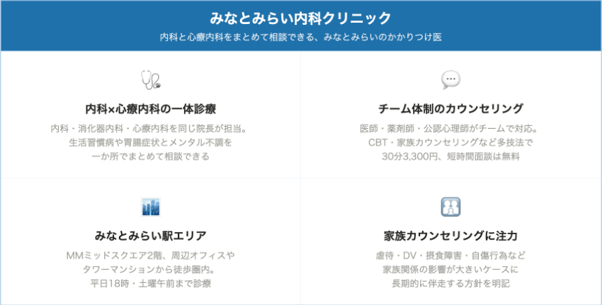 | みなとみらい内科クリニック | みなとみらい駅最寄 | 保険診療のみ・公式に金額明記なし | 保険診療のみ・公式に金額明記なし | 公認心理師などによるカウンセリング 30分 3,300円(10〜15分面談は無料) |