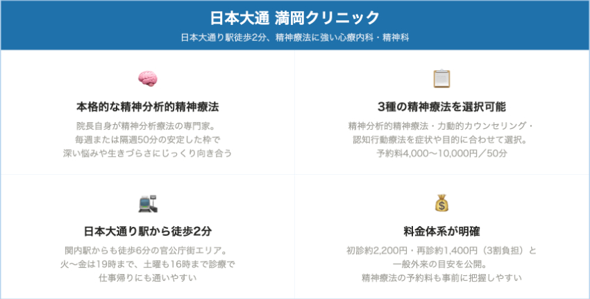| 日本大通 満岡クリニック | 日本大通り駅徒歩2分 / 関内駅徒歩圏 | 約2,200円 | 約1,400円 | 精神分析的精神療法 1回50分 10,000円 / 力動的カウンセリング 5,000円 / 認知行動療法 4,000円 |