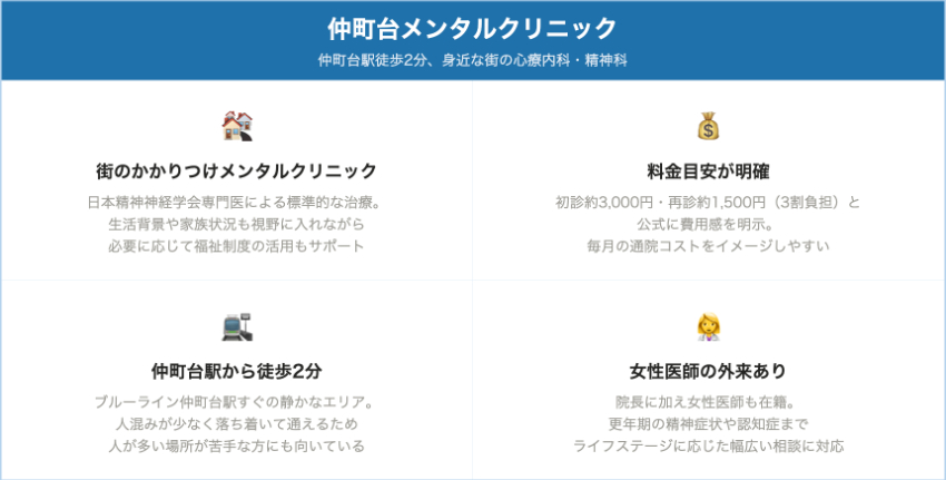 休職・復職、各種公的制度の利用に必要な診断書や意見書の作成料も細かく公開しており、メンタル不調と仕事・生活の両立を支える産業メンタルに強いクリニックと言えます。
