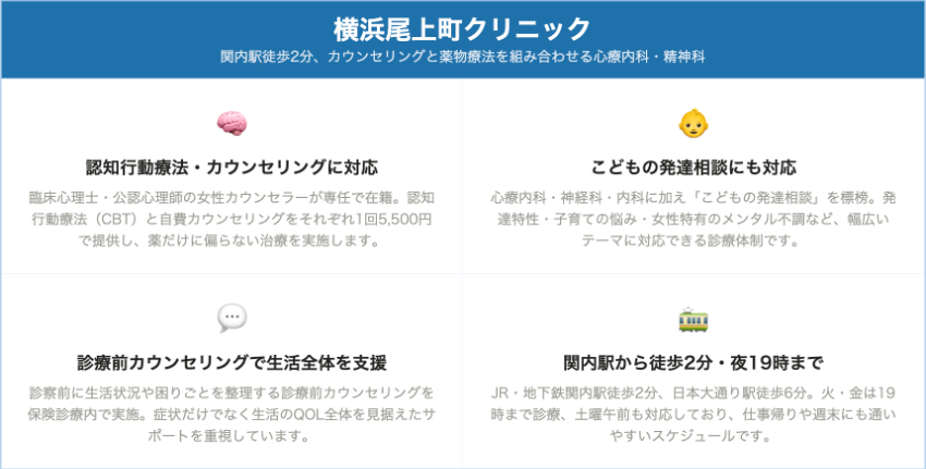 | 横浜尾上町クリニック | 関内駅徒歩2分・日本大通り駅徒歩6分 | 保険診療・具体額は公式に数値明記なし | 保険診療・具体額は公式に数値明記なし | 認知行動療法 1回 5,500円 / 自費カウンセリング 1回 5,500円(税込) |