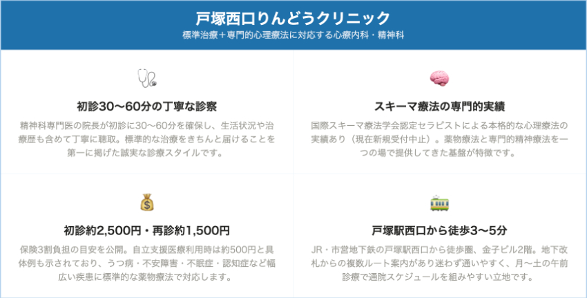 | 戸塚西口りんどうクリニック | 戸塚駅西口徒歩3分 | 例:初診 2,500円程度(3割負担) | 例:再診 1,500円程度(3割負担) | スキーマ療法 2回目以降:予約料 11,000円+保険診療分 |