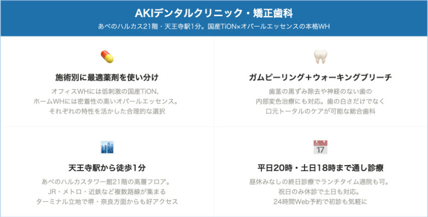 | AKIデンタルクリニック・矯正歯科 | 天王寺駅 徒歩1分(ハルカスタワー館21F) | 相談時に確認 | 相談時に確認 | 平日9:30~20:00、土日9:30~18:00 | 土日対応(祝日休診) | 相談時に確認 | オフィス:TiON/ホーム:オパールエッセンス | ガムピーリング、ウォーキングブリーチ |