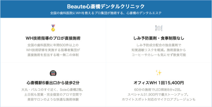 | Beaute心斎橋デンタルクリニック | 心斎橋駅6番出口 徒歩2分 | 15,400円~31,900円 | 31,900円(スターターキット) | 公式サイトで確認 | 公式サイトで確認 | 相談時に確認 | しみ予防成分配合・飲食制限なし | マイクロアブレージョン3,300円/1歯 |
