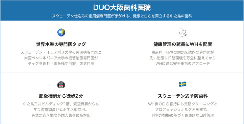 | DUO大阪歯科医院 | 肥後橋駅 徒歩2分/渡辺橋駅すぐ | 相談時に確認 | 相談時に確認 | ~19:00 | 平日のみ(土日祝休診) | 相談時に確認 | 院内採用薬剤 | 歯周病専門医+根管治療専門医、英語対応 |