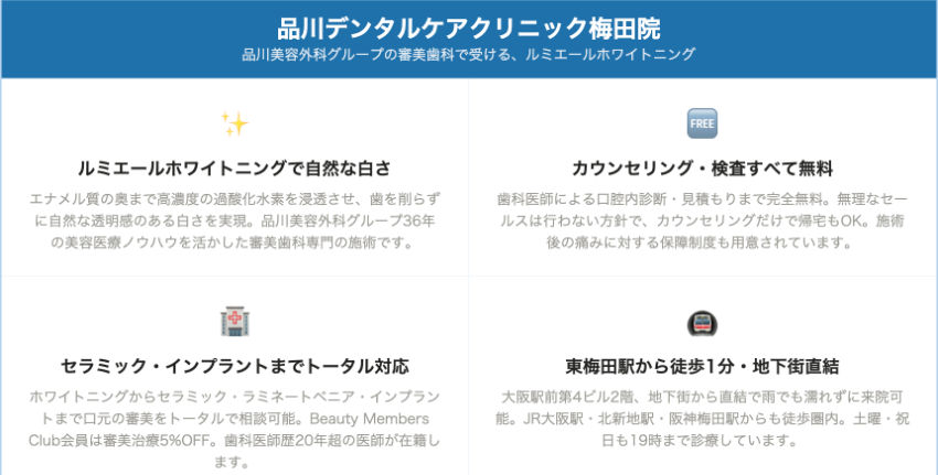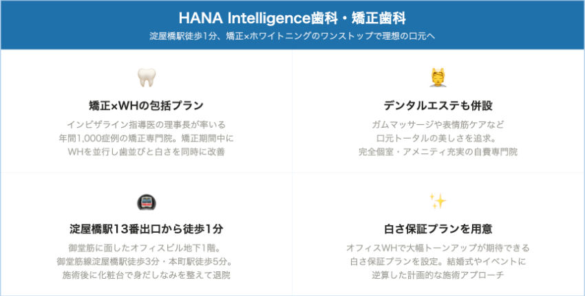 | HANA Intelligence歯科・矯正歯科 | 淀屋橋駅13番出口 徒歩1分 | 相談時に確認 | 相談時に確認 | 公式サイトで確認 | 公式サイトで確認 | 白さ保証プランあり | 高濃度薬剤 | 矯正(ファカルティ在籍)、デンタルエステ |