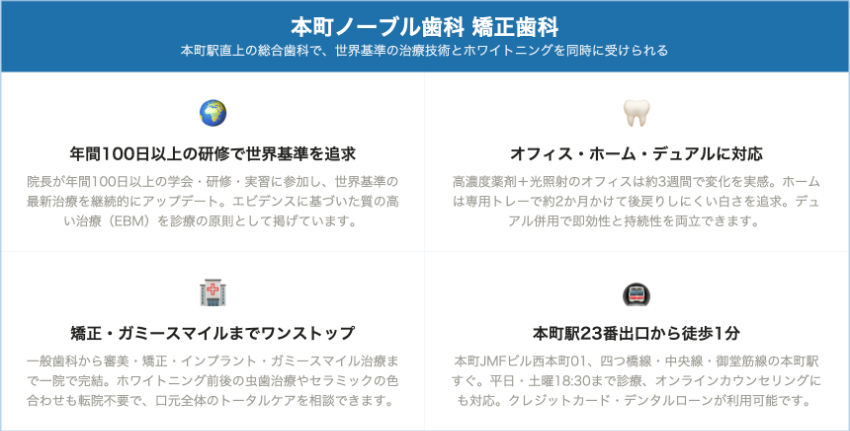 | 本町ノーブル歯科 矯正歯科 | 本町駅23番出口 徒歩1分 | 相談時に確認 | 相談時に確認 | ~18:30 | 土曜対応(日祝休診) | 相談時に確認 | 高濃度薬剤+光照射 | 矯正、ガミースマイル、オンライン相談対応 |