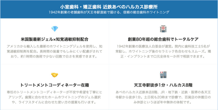 天王寺・阿倍野エリアではアキデンタルクリニックがJR天王寺駅から徒歩1分の場所にあり、オフィスホワイトニングとホームホワイトニングの両方に対応しています。国産のホワイトニング剤ティオンを使用しており、しみにくさに配慮した施術が特徴です。小室歯科・矯正歯科 近鉄あべのハルカス診療所はあべのハルカス近鉄本店内にあり、土日祝も20時まで診療しているため、休日のお出かけついでに通院しやすい環境が整っています。