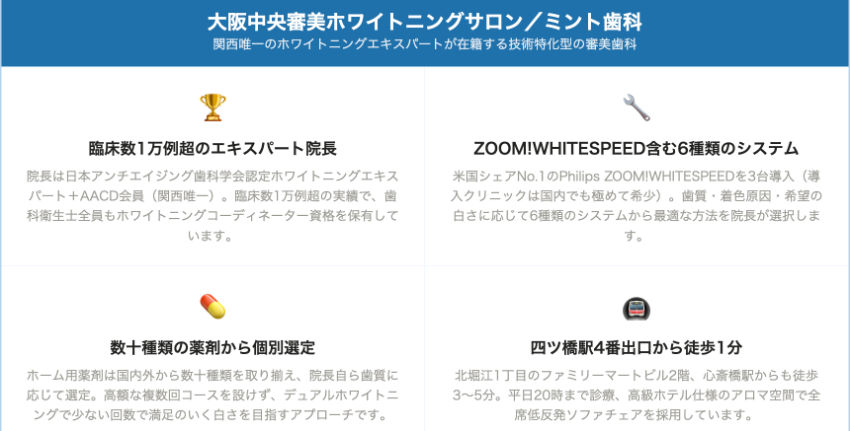 | 大阪中央審美ホワイトニングサロン/ミント歯科 | 四ツ橋駅 徒歩1分 | 相談時に確認 | 相談時に確認 | 公式サイトで確認 | 公式サイトで確認 | 相談時に確認 | ZOOM!WHITESPEED等6種類 | セラミック、ホワイトニングエキスパート在籍 |