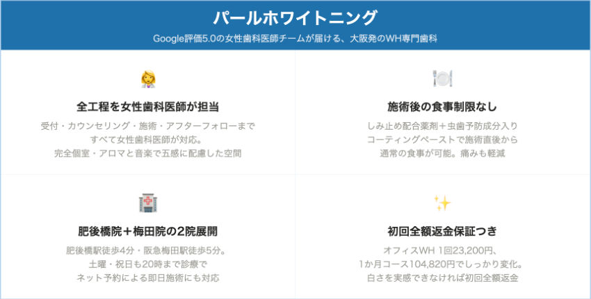 | パールホワイトニング | 肥後橋駅3番出口 徒歩4分 | 23,200円 | 25,520円 | 10:00~20:00 | 土日対応(公式で確認) | 相談時に確認 | 施術後コーティングで食事制限なし | デュアル、1か月コース104,820円 |