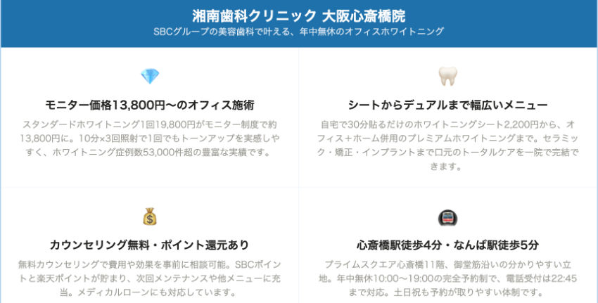 | 湘南歯科クリニック大阪心斎橋院 | 心斎橋駅4-B出口 徒歩4分 | 19,800円(3回コース49,800円) | 相談時に確認 | 院により異なる | 年中無休 | 相談時に確認 | 独自システム | ホワイトニングシート2,200円 |