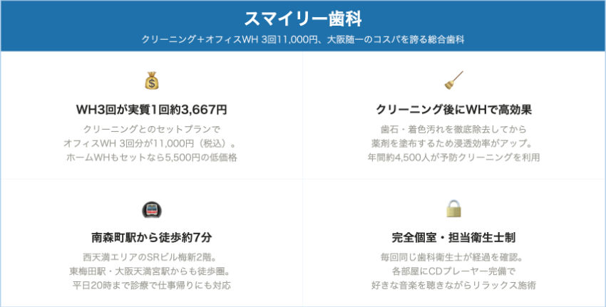 | スマイリー歯科 | 南森町駅1番出口 徒歩7分 | 11,000円(単発)/3回セット11,000円 | 5,500円(クリーニングセット) | 公式サイトで確認 | 公式サイトで確認 | 相談時に確認 | 院内採用薬剤 | 担当衛生士制、完全個室 |