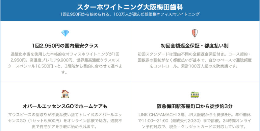| スターホワイトニング大阪梅田歯科 | 阪急大阪梅田駅 茶屋町口 徒歩3分 | 2,950円~29,700円 | – | 10:00~21:00 | 年中無休 | 全額返金保証あり(初回スタンダード) | 過酸化水素(濃度別3プラン) | クリーニング |