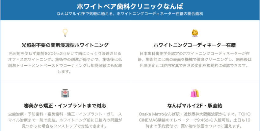 | ホワイトベア歯科クリニックなんば | なんば駅すぐ(なんばマルイ2F) | 相談時に確認 | 相談時に確認 | ~19:00 | 土日対応 | 相談時に確認 | 光照射不要薬剤(20分×2回浸透) | WH コーディネーター在籍、デュアル対応 |