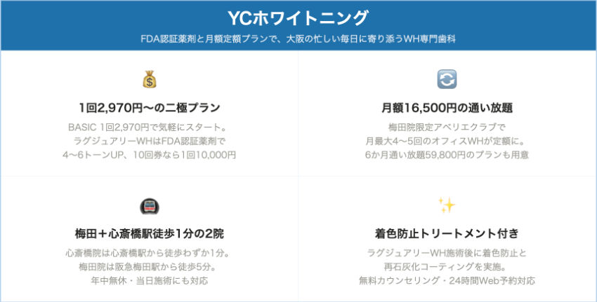 | YCホワイトニング(梅田院・心斎橋院) | 阪急梅田駅 徒歩5分/心斎橋駅 徒歩1分 | 2,970円~17,300円 | 相談時に確認 | 平日~20:00、土日祝~19:00 | 年末年始以外対応 | 相談時に確認 | 複数プラン(BASIC~LX) | 月額定額16,500円(梅田院限定) |