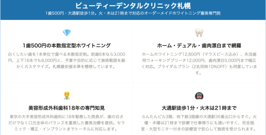 料金の最安値はさくらさくデンタルクリニック(片顎8,000円〜)または本数制のビューティーデンタルクリニック札幌・デンタルクリニック大通り(少数本なら低価格)で、コスト重視の方向けです。