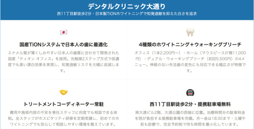 | 医療法人社団 デンタルクリニック大通り | 中央区・西11丁目駅徒歩2分 | 2,200円〜3,300円(1歯あたり・本数で単価変動) | 11,000円〜(片顎マウスピース)+ジェル2,600円/本 | 来院時確認 | – | 休診 | 最終18:30 | 提携駐車場(治療時間分無料) | クレジットカード・デンタルローン |