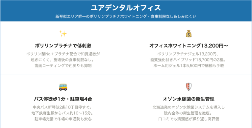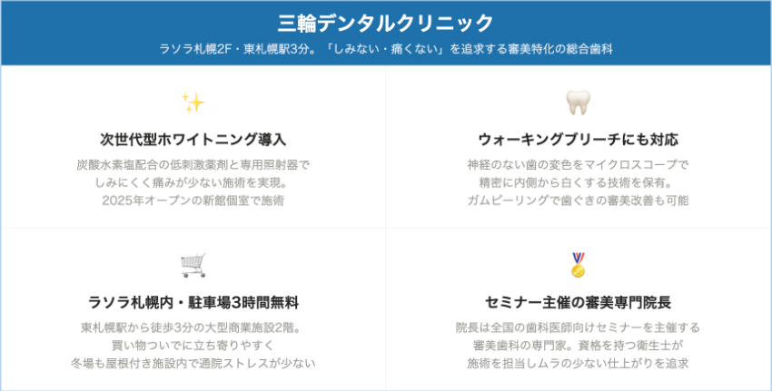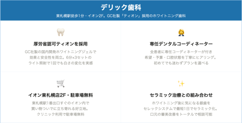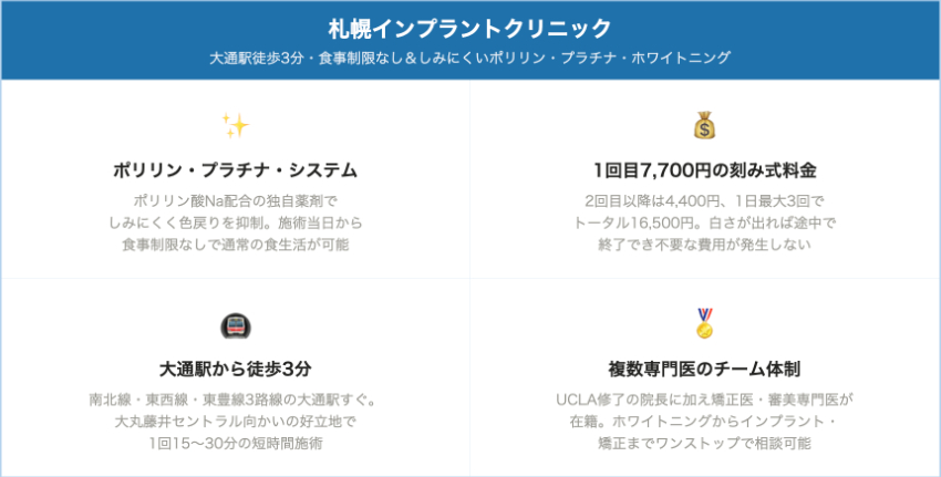 ポリリンプラチナシステムを採用しているユアデンタルオフィス(北区新琴似)や、食事制限なしを特徴として掲げる札幌インプラントクリニック(南2条西3丁目)では、施術後の食事制限が通常のホワイトニングよりも緩和されているケースがあります。食事制限が気になる方は、こうした薬剤システムを採用しているクリニックを選ぶことも選択肢に入れるとよいでしょう。