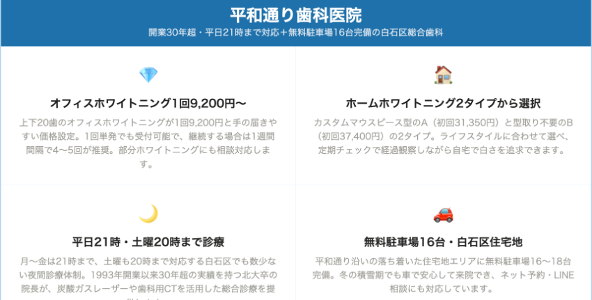 | 医療法人社団 平和通り歯科医院 | 白石区・南郷13丁目駅徒歩13〜16分 | 9,200円(1回・上下20歯の場合の例) | 31,350円(Aタイプ初回セット) | – | – | 特定日曜のみ(要予約) | 月〜金 21:00・土 20:00まで | 無料16台 | クレジットカード・スルガ銀行デンタルローン・オリコWebデンタルクレジット |