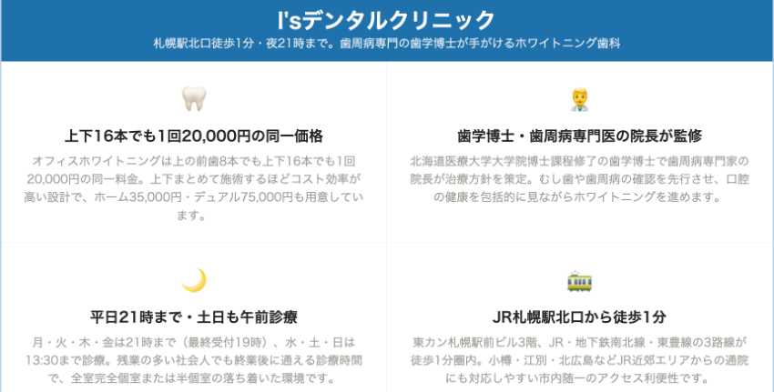 | I’sデンタルクリニック | 北区・札幌駅徒歩1分 | 20,000円(上8本または上下16本) | 35,000円(上下) | 75,000円 | – | 水・土・日 13:30まで | 月・火・木・金 21:00まで | なし | PayPay(詳細は来院時確認) |
