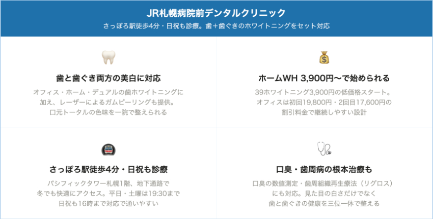 | 医療法人 永孝会 JR札幌病院前デンタルクリニック | 中央区・さっぽろ駅徒歩4分 | 19,800円(1回目)・17,600円(2回目) | 3,900円(39ホワイトニング) | – | 7,000円〜(ガムピーリング) | 日祝 10:30〜16:00 | 最終19:30 | なし | 来院時確認 |