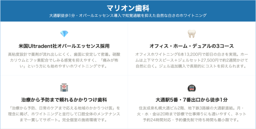 また、クリニックによっては施術前にPMTC(プロフェッショナルクリーニング)を行い、歯石・歯垢を除去してから薬剤を塗布する手順を踏みます。JR札幌病院前デンタルクリニックはPMTCを単体メニューとして用意しており(30分・5,500円、45分・8,800円)、ホワイトニング前後のクリーニングも同院で受けられます。