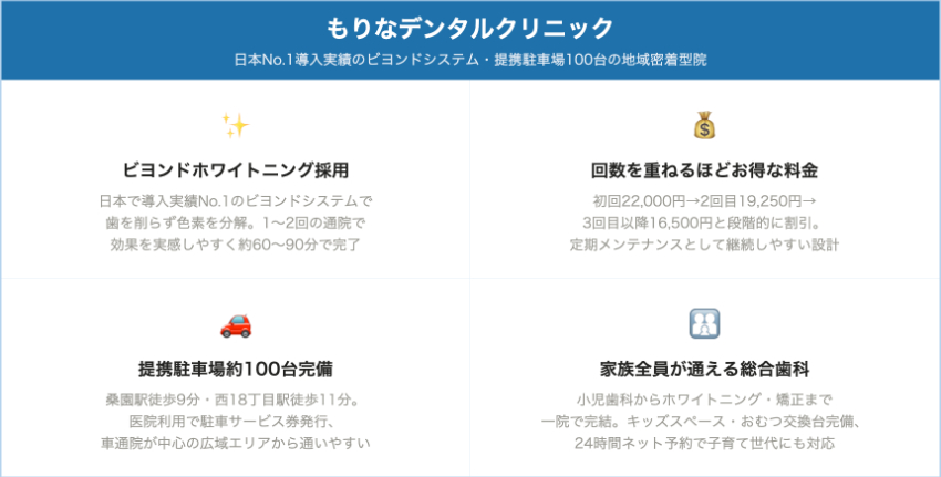 比較の際は料金だけでなく、1回あたりの施術時間・通院回数の目安・ホームホワイトニングとのセット対応の有無・診療時間の長さ・日祝診療の可否を合わせて確認するとよいでしょう。公式サイトに料金が明示されているクリニックを優先して比較すると、後から追加費用が発生するリスクを下げられます。